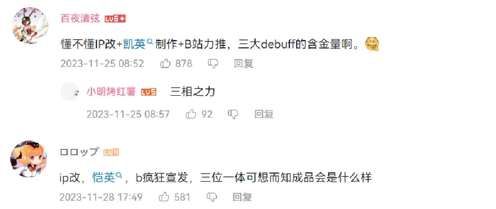 但现实却是,代理的ACG游戏,在B站被玩家狠狠地拷打就是“换皮”,甚至已经反向总结出“IP漫改+恺英制作+B站发行”的踩坑公式。
