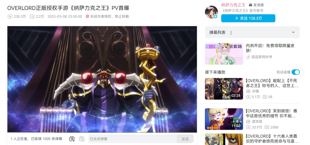 以最近一部恺英制作,B站研发的手游《纳萨力克之王》为例。这部手游的原作《OVERLORD》前三季在B站独播,有4.5亿播放,1000万人追番。