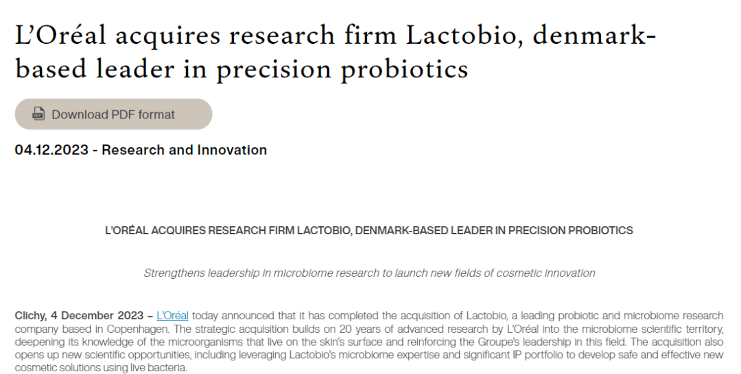 近日,欧莱雅在官网宣布,已完成收购位于丹麦哥本哈根的益生菌和微生物群系研究公司Lactobio。