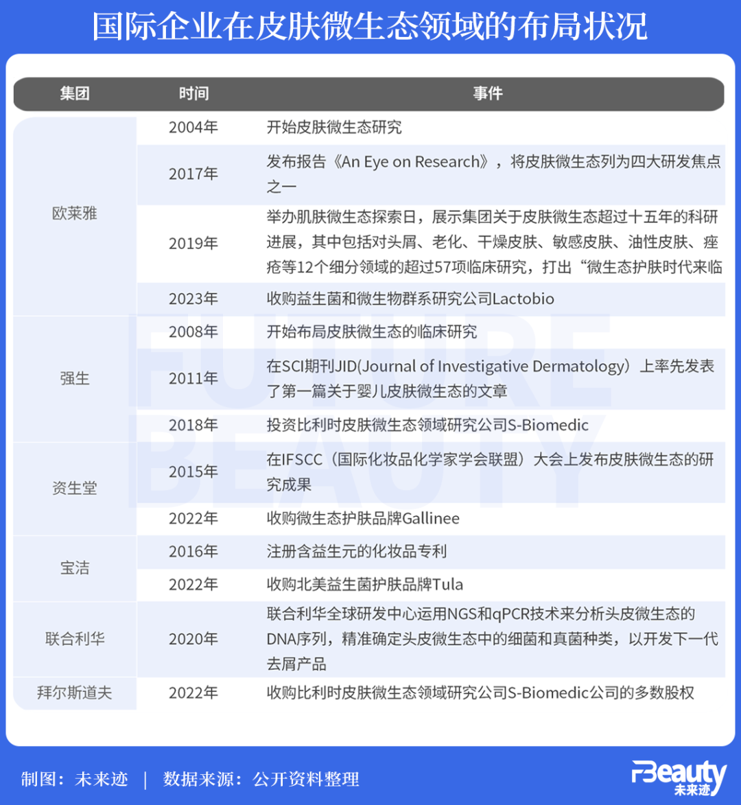 在化妆品领域,头部化妆品公司对皮肤微生态的研究也早从21世纪初就开始了。欧莱雅和强生于2000年之后开始对皮肤微生态进行研究,是最早一批踏入该领域的化妆品集团。随后,资生堂、宝洁、联合利华、拜尔斯道夫也先后加入皮肤微生态赛道。
