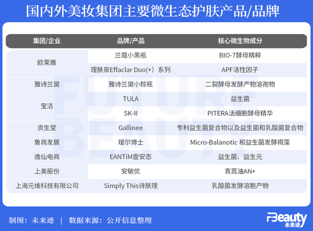 目前,国内外多家企业都推出了含核心微生物成分的产品,例如SK-II神仙水里的Pitera是半乳糖酵母样菌发酵产物滤液,也是一种后生元,其作用于皮肤上时可以提高皮肤表面有益菌群的活性,达到对有害菌群的抑制作用,从而实现促进新陈代谢、延缓皮肤细胞衰老的效果。