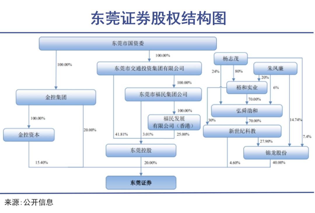 目前,锦龙股份以及同样由杨志茂控制的新世纪科教分别持有东莞证券40%、4.60%的股权。而东莞市国资委通过东莞发展控股股份有限公司、东莞金融控股集团有限公司、东莞金控资本投资有限公司间接控制东莞证券55.40%的股份。