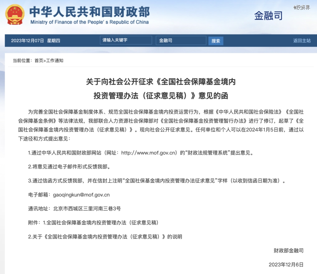 投资界—解码LP获悉,近日,财政部联合人力资源社会保障部发布《全国社会保障基金境内投资管理办法(征求意见稿)》(下称《管理办法》),向社会公开征求意见。