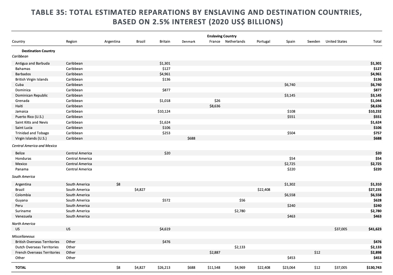 该报告显示以2.5%的利息计算,包括巴西、英国、荷兰、美国等所有前殖民国家的总欠款高达131万亿美元。其中英国欠包括古巴、多米尼加、海地等所有受跨大西洋奴隶贸易影响的国家和地区26万亿美元;美国背负37万亿美元的历史债;荷兰欠款则为4万亿美元。
