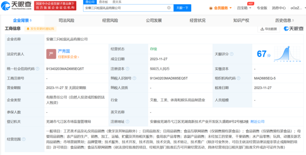 天眼查App显示,近日,安徽三只松鼠礼品有限公司成立,法定代表人为严秀国,注册资本500万人民币,经营范围含工艺美术品及礼仪用品销售、日用品销售、食品互联网销售、食用农产品零售、市场营销策划、品牌管理等。股权全景穿透图显示,该公司由安徽三只松鼠食品有限公司全资持股,后者为三只松鼠全资子公司。(天眼查)