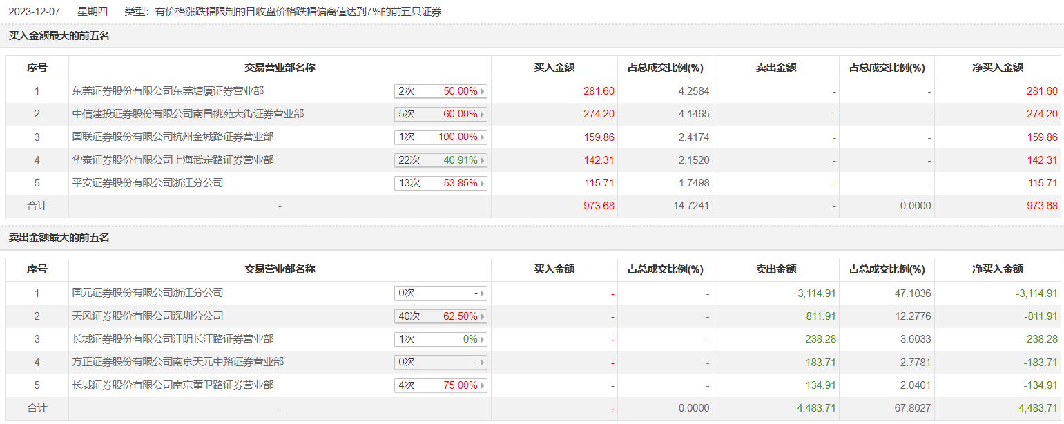 恒润股份12月7日跌停,全天换手率达0.55%,振幅达0%。龙虎榜数据显示,营业部席位合计净卖出3510.03万元。其中,国元证券浙江分公司、天风证券深圳分公司分别卖出3114.91万元、811.91万元;东莞证券东莞塘厦证券营业部、中信建投证券南昌桃苑大街证券营业部分别买入281.60万元、274.20万元。