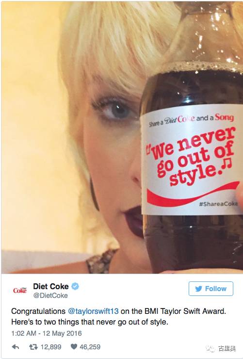 健怡可乐恭祝泰勒获得BMI流行音乐大赏的Taylor Swift Award(一点都没有悬念的奖赏)的推文获得了2016年全年最多的回复数。好吧,你赢了。