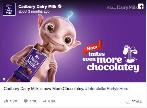 吉百利巧克力的印度公司在Facebook上发布了一条内容,其中使用了2016国外最流行的病毒视频中的一个发疯外星人形象。这条内容得到了最多的赞。