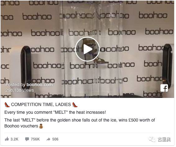 英文界的唯品会和蘑菇街Boohoo也做了个简单直白但是参与量超高的Facebook帖子。帖子里面有一只被冰封起来的鞋子,所有留言都可以让环境热起来,如果你碰巧在冰全部融化的一刻留言的话,就可以得到这双鞋子。