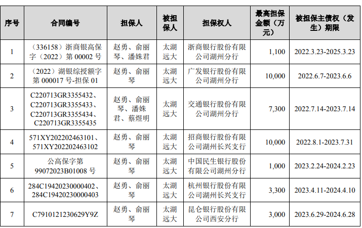 担保合同则有7份,担保人均为公司实控人赵勇、俞丽琴、潘姝君三人,被担保人则是太湖远大。近几年,赵勇、俞丽琴、潘姝君三人累计为太湖远大担保资金高达3.57亿元,这些资金大部分是一年以内的短期借款,仅一笔1100万资金借款期限为3年。`