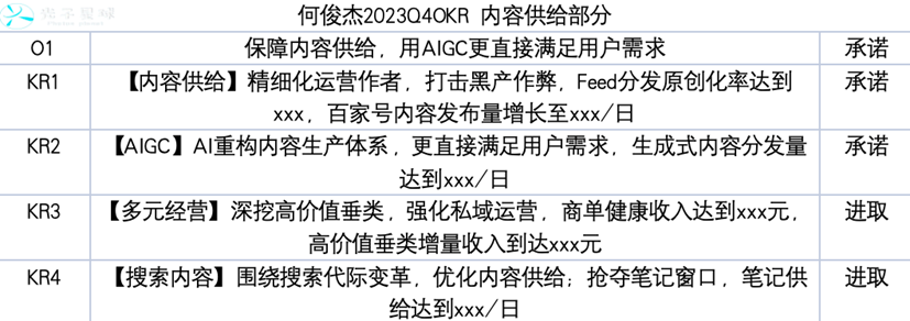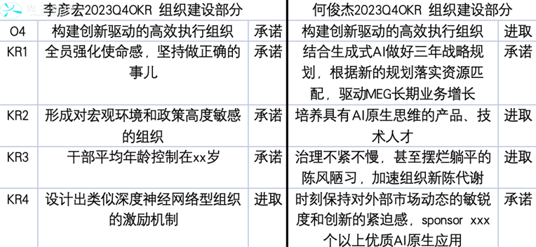对比李彦宏与何俊杰OKR的对齐情况可以看到,在集团组织建设有更刚性的要求下,MEG反而动作相对较小,一个进取型的O与两个进取型的KR。