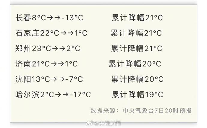 @央视新闻 微博消息,12月8日,中东部大部地区维持升温态势,多地将体验到12月同期罕见暖热。由于昼夜温差大,太原石家庄一天可体验两个季节。然而,明天起,两轮冷空气“无缝衔接”,中东部多地将经历俯冲式降温:东北、华北、黄淮局地降幅超15℃,不少地方两三天最高气温累计降幅将超20℃。