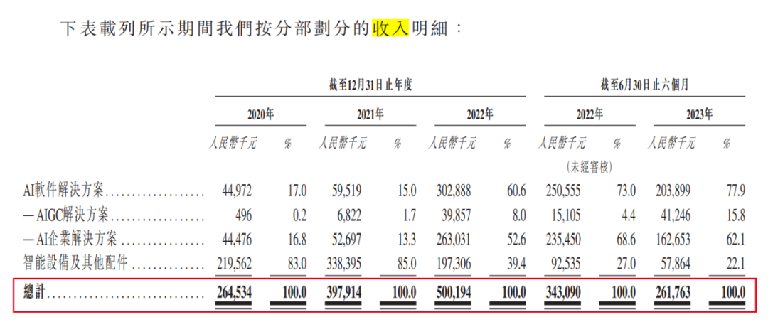从业务条线来看,出门问问分为AI软件解决方案、智能设备及其他配件两大板块。其中,AI软件解决方案中包含AIGC、AI企业两大解决方案。截至2023年6月30日,AI企业解决方案贡献了62.1%的收入。