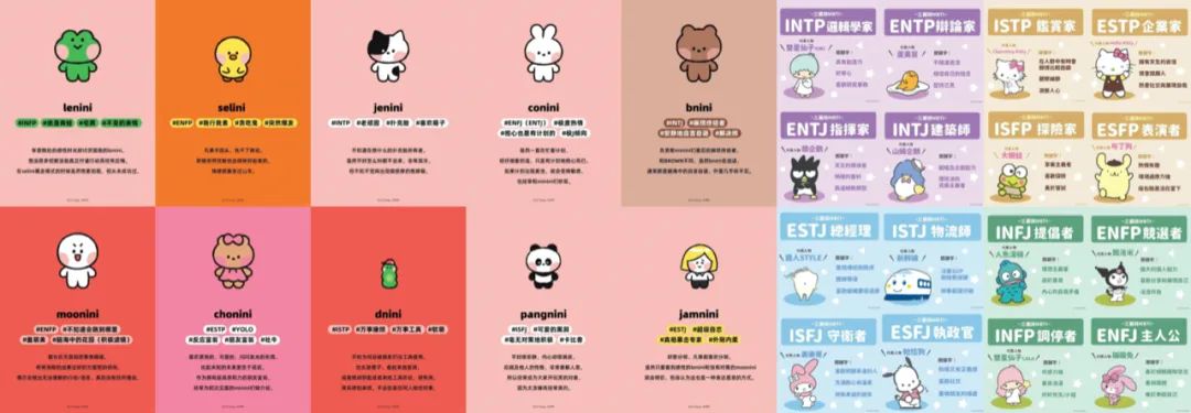 LINE FRIENDS官方就为旗下的不同IP形象赋予了不同的MBTI,例如小网红lenini是INFP,对应标签为“浪漫青蛙”“宅男”,奶牛猫jenini则因为“扑克脸”被定义为INTP;三丽鸥家族同样公布了旗下知名IP形象的MBTI,例如喜欢照顾身边的人、充满耐心的ISFJ美乐蒂,有强大个人魅力、喜欢分享和展示自己的ENFP库洛米等等。