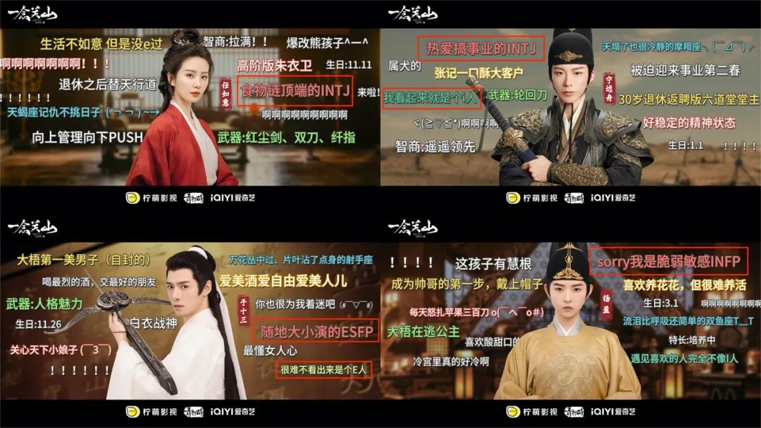 就连最近的大热剧集《一念关山》,也乘着这股风,在预告阶段就公布了主角团的MBTI,“食物链顶端的INTJ”“我看起来就是个i人”“随地大小演的ESFP”“sorry我是脆弱敏感INFP”……狠狠进行了一波“性格营销”。