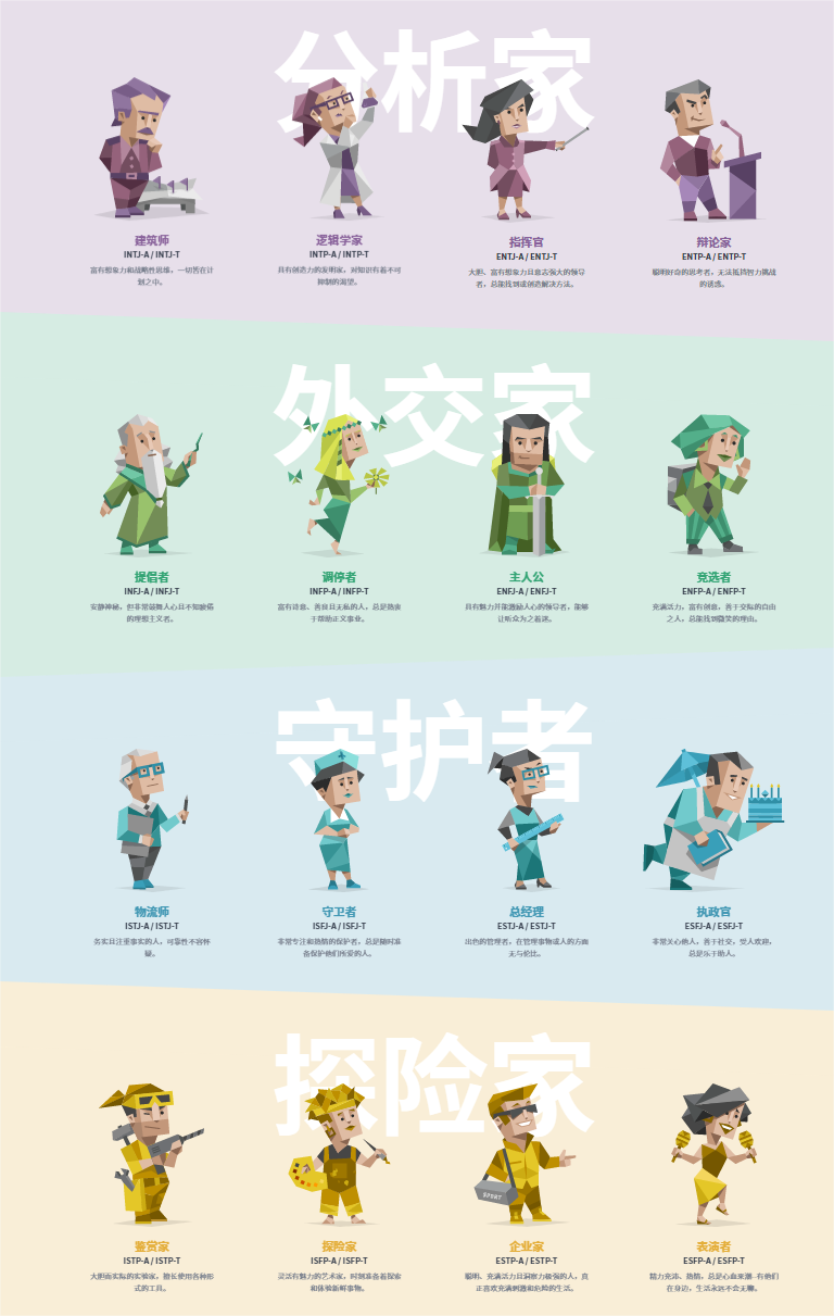 MBTI的全称是迈尔斯-布里格斯类型指标,从荣格的性格分类发展而来,在外向和内向(E和I)、直觉和感觉(S和N)、思考和情感(T和F)和判断和感知(J和P)四组维度上,将人大致划分成了16种性格类型,并赋予其身份。