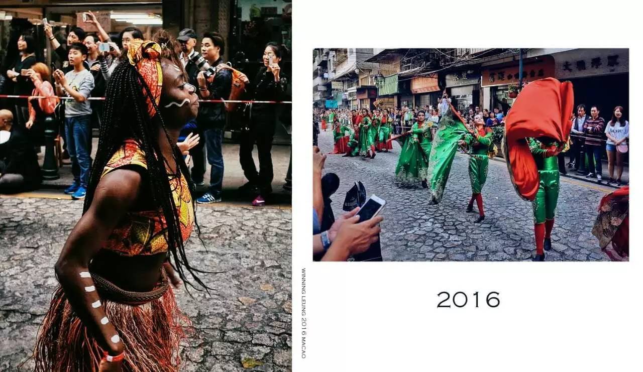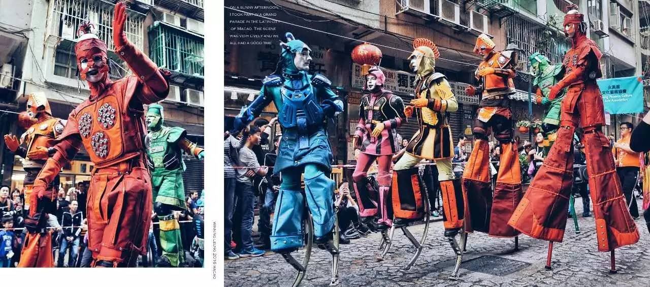 以上大片来自我们的旅行达人兼上海飞小编Winning同学。这组照片摄于去年12月的澳门,街上巡游的人们穿着奇装异服,一边行进一边表演,这色调,这构图、这场面,分明有一种在国外的镜头感!