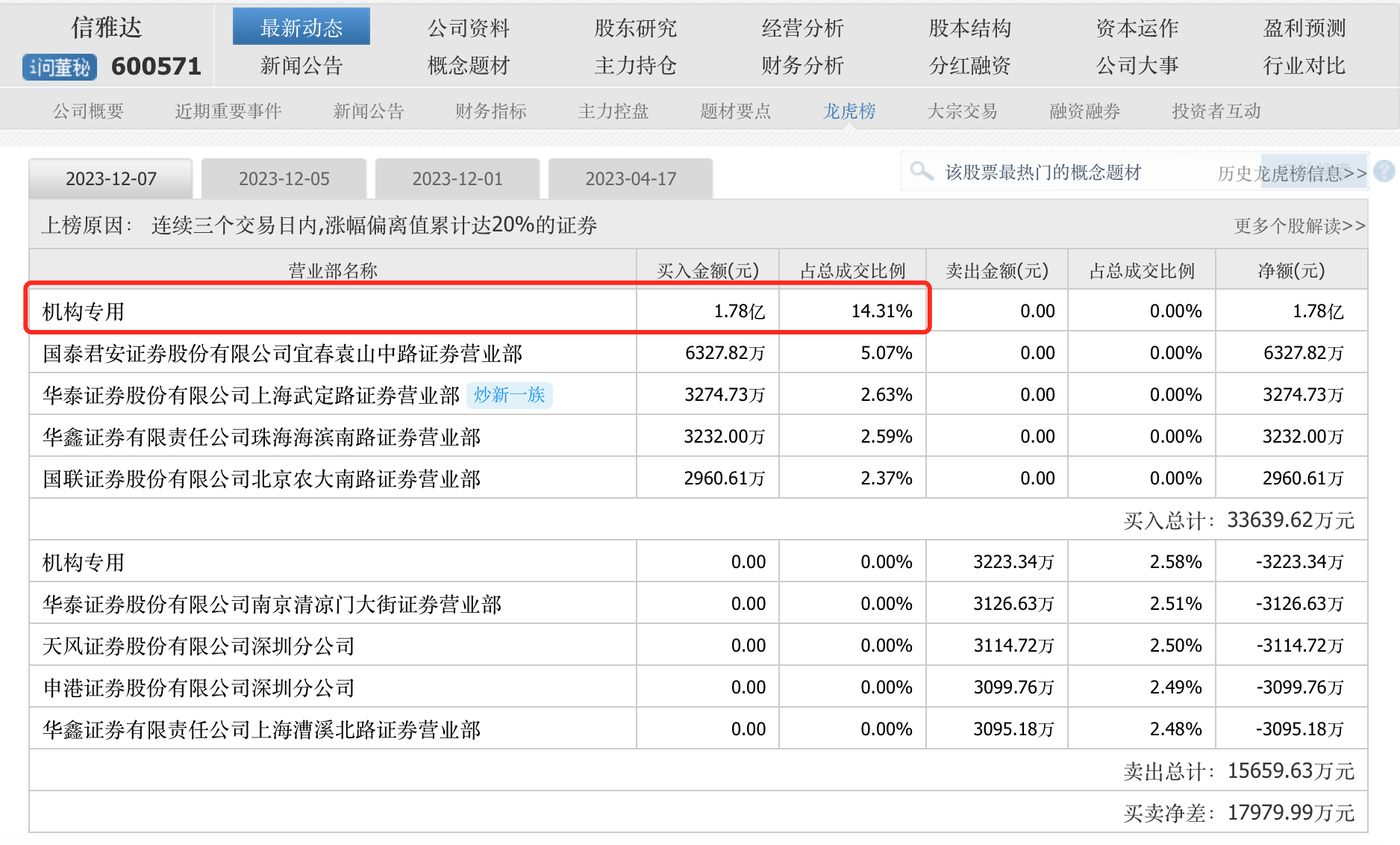 根据信雅达12月7日的连续三日龙虎榜显示,连续三天时间里,一“机构专用”席位抢筹1.78亿元,位列第一,占到了3天总成交的14.31%,远远超过第二位的国泰君安宜春袁山中路营业部。连续三天中,买卖前五的净差为1.8亿元左右。