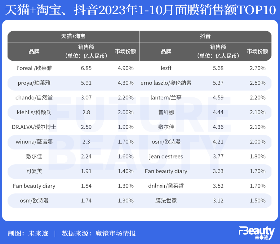 魔镜市场情报显示,2023年1-10月,天猫+淘宝的贴片面膜类产品总销售额达138.61亿元,销量为1.3127亿;抖音平台的贴片面膜/涂抹面膜1-10月总销售额达209.51亿,同比下降2.9%,总销量为2.2823亿,同比增长0.8%。