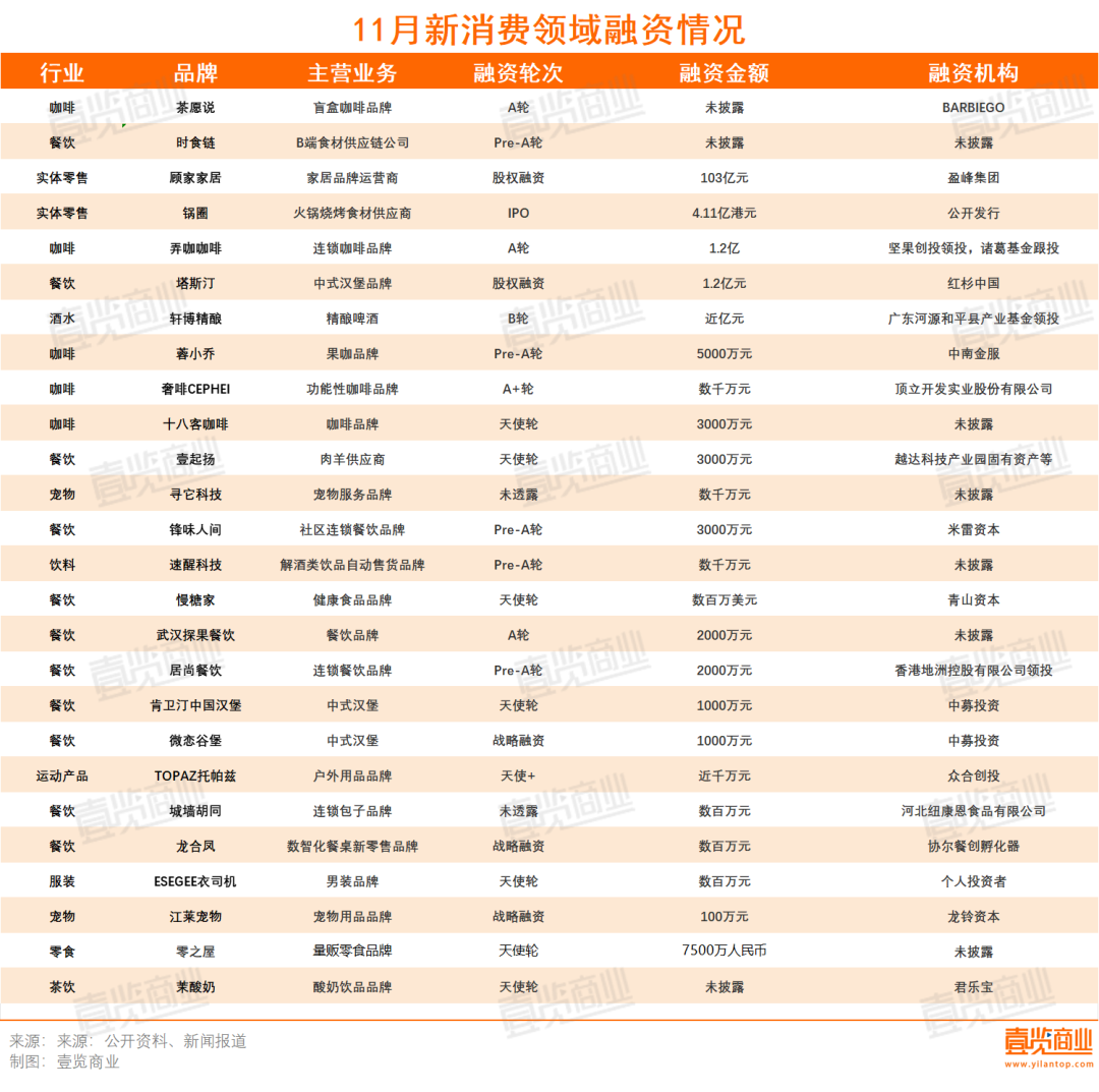 锅圈是11月融资金额仅次于顾家家居的品牌,由于其IPO,获得了累计4.11亿港元,折合人民币3.75亿元人民币的融资。