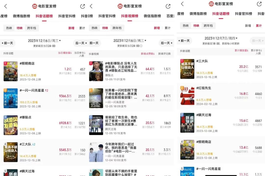 要说是“下雪场”够创意、够出圈,可该抖音话题播放量才3000多万。12月6日,《亮星星》增加了30万猫眼想看人数,但当日在抖音话题榜不如《照明商店》、抖音视频榜不如《爆裂点》。而且《亮星星》电影版11亿的抖音话题播放量,在一众待映电影里仅排第五名。