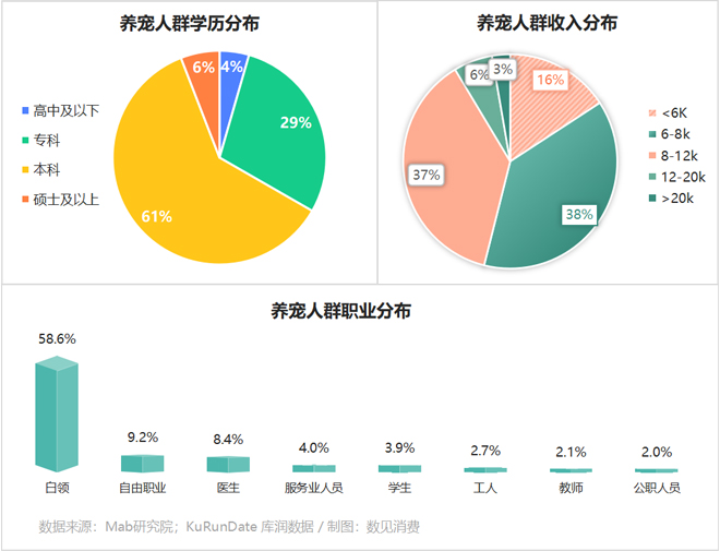 在快节奏工作生活的社会环境下,空巢老人、独居青年、单身人群、丁克家庭的数量都在上升,“孤独感”促使越来越多人加入养宠队列。据调查,宠物主以90后为主,高学历、高收入,近六成是企业白领。节奏快、压力大的工作生活状态,催生缓解压力的需求。需求的激增推动了宠物市场的快速发展。
