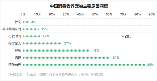 养宠人群的诉求大多围绕着陪伴需求与情感需求上,众多养宠原因中选择”陪伴自己“占比85%,排第一位;“增加生活乐趣”占比61%,排第二;“解压”占比47%,排第三。