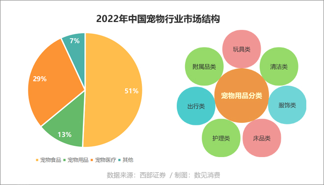 目前国内宠物市场细分市场仍在初步阶段,大类分为宠物食品、宠物医疗,宠物用品,宠物生活服务。据统计,2022年宠物用品市场占比13.3%,目前低于宠物食品与宠物医疗行业占比,排名第三。