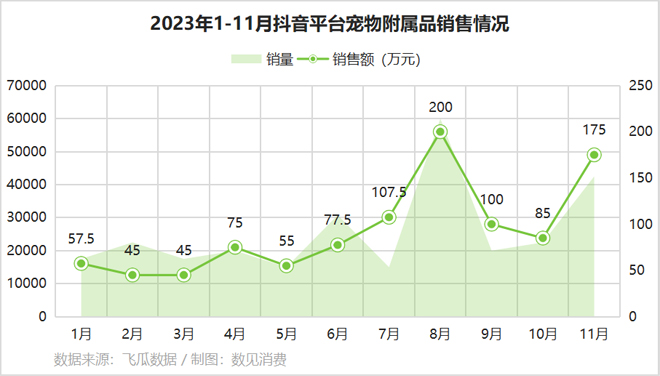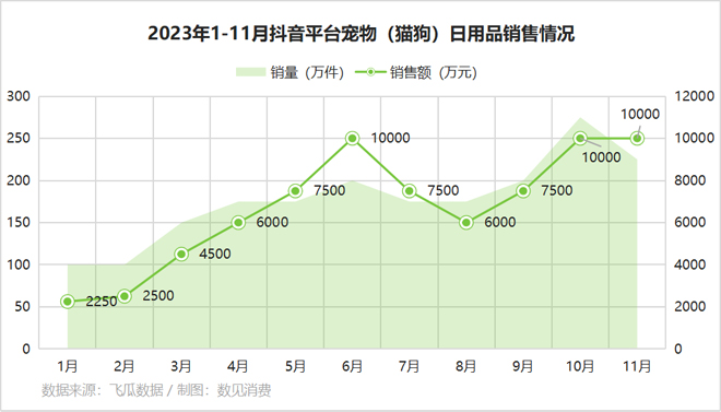 在年轻用户群体高度聚集的社媒电商抖音平台上,今年1-11月宠物(猫狗)日用品销量与销售额双双呈上涨趋势,6月与10月两次达到销售额高峰1亿元,销量分别达到200W,275W。