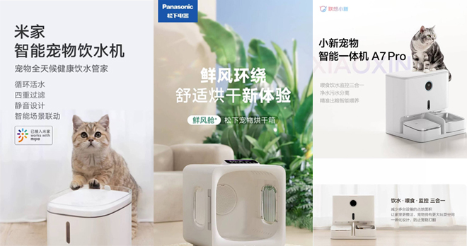 目前,智能宠物用品中,智能饮水机、智能摄像头、智能喂食器渗透率位居前列。许多3C数码大品牌早早就加入该赛道,纷纷推出了智能宠物用品周边。如小米品牌的智能饮水机、联想的宠物智能喂食器、松下电器的宠物烘干箱等。