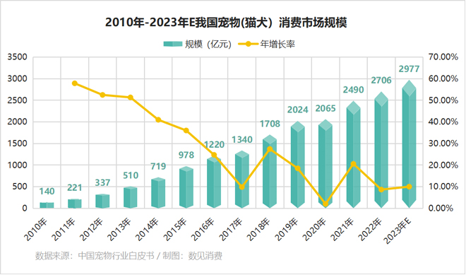 近年,宠物消费赛道增速飞快。2010年我国宠物市场消费规模仅140亿,2022年达到2706亿元,其中宠物用品规模预计369亿元。有报告称,2025年我国的宠物市场规模预计将达到6490.9亿人民币。近10年增长率基本维持在10%以上(除疫情影响外)。
