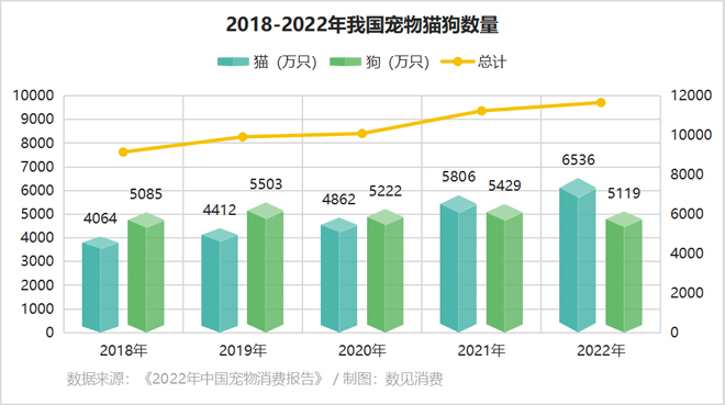 2022年我国宠物猫狗数量约为1.2亿只,到2023年我国宠物猫犬数量预计达到1.9亿只。行业报告指出,未来五年,犬猫数量预期将从2023年1.9亿只增至2.1亿只,其中猫的数量随着养宠偏好的变化预期超过1.1亿只。