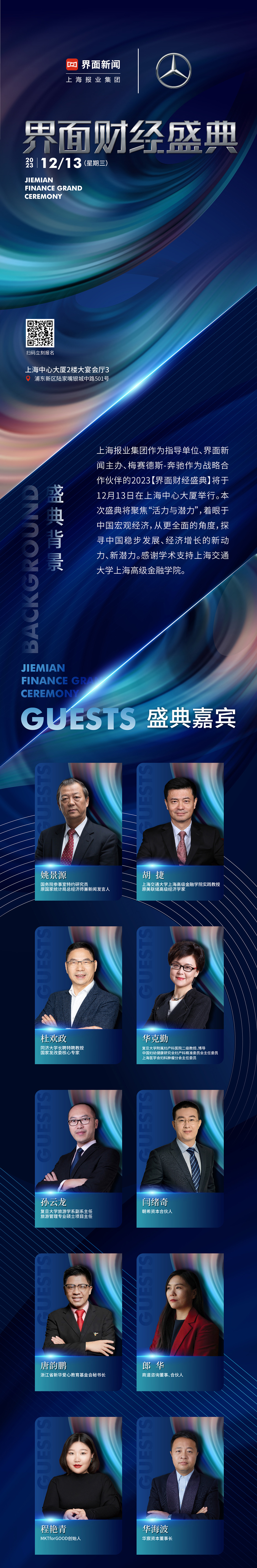 作为国内领先的原创财经媒体,上海报业集团 | 界面新闻将于2023年12月13日星期三在上海中心大厦2楼大宴会厅3(浦东新区陆家嘴银城中路501号)举办2023【界面财经盛典】,并再次集结国内政商学界领袖与专家学者最强阵容,围绕“活力与潜力”,着眼于中国经济战略,聚焦重点行业、公益慈善,从更全面的角度,探寻中国稳步发展、经济增长的新动力、新潜力。特别鸣谢本次盛典战略合作伙伴梅赛德斯-奔驰、学术支持上海交通大学上海高级金融学院。