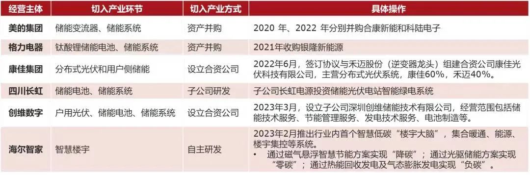 在户储领域,海尔是较早切入分布式光伏的家电巨头之一,如早在2015年,海尔已发布光伏家庭能源系统;2022年,海尔旗下日日顺新能源科技还收购了以储能技术为主营业务之一的纳晖能源科技,自此海尔也顺利进入光储市场;2023年,海尔也推出智慧低碳“楼宇大脑”,并在储能热管理系统提出全产业链解决方案等。另外,康佳与长虹两家黑电企业分别以设立合资公司与子公司方式开展储能业务。具体而言,康佳侧重于户用储能,长虹则聚焦储能电池、储能系统。