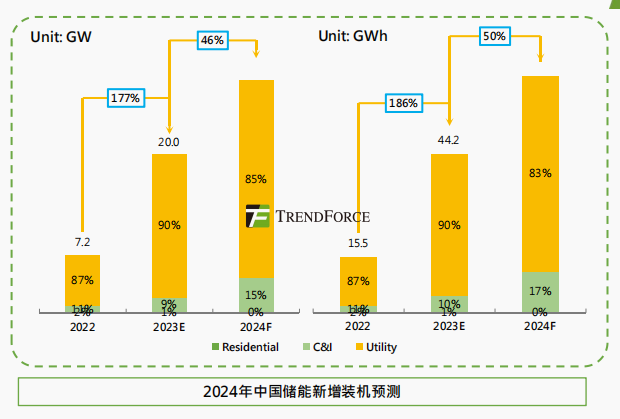 展望2024年,TrendForce储能分析师认为,中国储能新增装机将持续高增,预计同比增长46%~50%。具体来看,户储方面,由于国内电力基础设施建设较为完善,居民用电价格处于世界中低水平,因此,储能项目经济性低短期内难见增量涌现;工商储方面,随着电改逐步推进,工商业峰谷电价差持续拉大的预期明确,且工商业户主用电需求较大,部署储能系统具备较高经济性;大储方面,风光大基地项目及市场化与保障性风光项目对电网容量需求日益增大,对于大储的装机迫切性逐步提高。