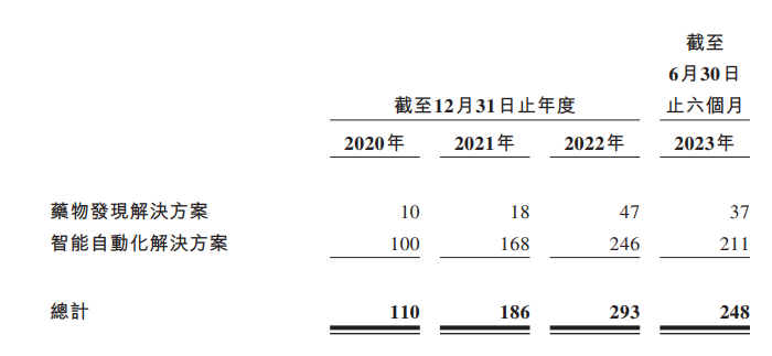 过去几年,晶泰科技不论是药物发现解决方案还是智能自动化解决方案收入均在快速增长。数据显示,2020年两个方案合计项目为110个,2022年底增长至293个。