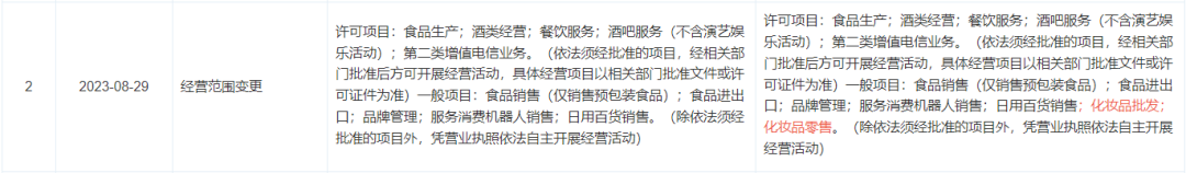 天眼查显示,新酒业公司的经营范围在8月29日才增加了化妆品批发和零售两项。