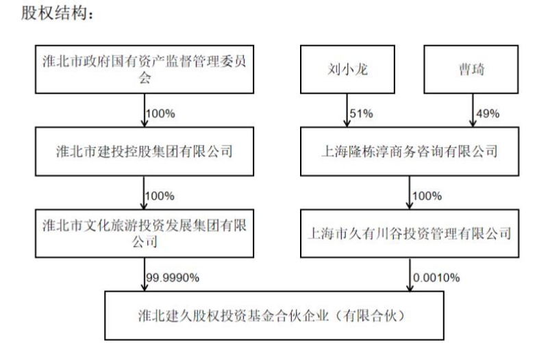 值得一提的是,本次受让方淮北建久是新成立的有限合伙企业,成立日期为2023年11月8日,出资额100001万元(也就是比10亿元多了1万元)。其执行事务合伙人为上海久有川谷投资管理有限公司,出资占比0.001%,股权穿透为刘小龙持股51%,曹琦持股49%。