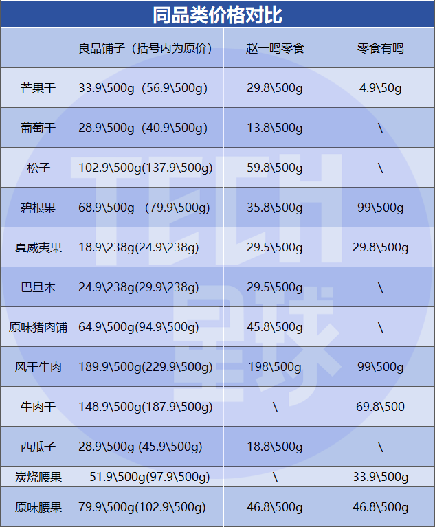 但和赵一鸣、零食有鸣等零食折扣店相比,在价格这一维度上,降价后的良品铺子还是不占优势。Tech星球将部分同品类商品价格进行比对发现,良品铺子在果脯、肉类上价格能达到持平,在坚果品类上还是存在一定价格差。