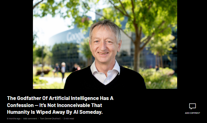 《纽约客》杂志2023年11月20日出版的一篇文章《Why the Godfather of A.I. Fears What He’s Built》(人工智能教父为何害怕自己的成果)中,图灵奖得主杰弗里·辛顿(Geoffrey Hinton)直言:“我们不知道人工智能会变成什么样子。”但当记者问:“为什么不直接拔掉插头呢?”辛顿回答:“因为不同国家之间的竞争。”而此前,他曾拒绝签署一份呼吁暂停研究人工智能至少6个月的请愿书,并表示:“中国可不会停止研发6个月”。有理由相信,出于政治博弈的考虑,某些政府、企业或科学家,会对人工智能的风险,干脆放任自流。