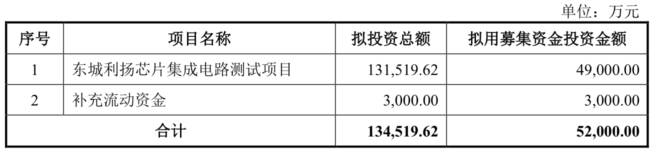 利扬芯片融资的5.2亿元中,有4.9亿元将投入到“东城利扬芯片集成电路测试项目”。据悉,“东城利扬芯片集成电路测试项目”建设完成后,将新增100.74万小时CP测试服务、114.68万小时FT测试服务产能,项目建设期36个月,募资主要购置芯片测试所需的相关设备,扩大芯片测试产能。利扬芯片预计,项目达产后,预计稳定运营后将实现年营业收入64571.98万元。