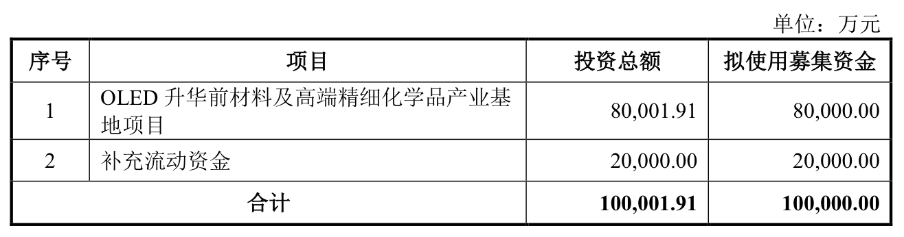 瑞联新材融的10亿元,最大投入是“OLED升华前材料及高端精细化学品产业基地项目”,额度为8亿元,剩下2亿元瑞联新材打算补充流动资金。