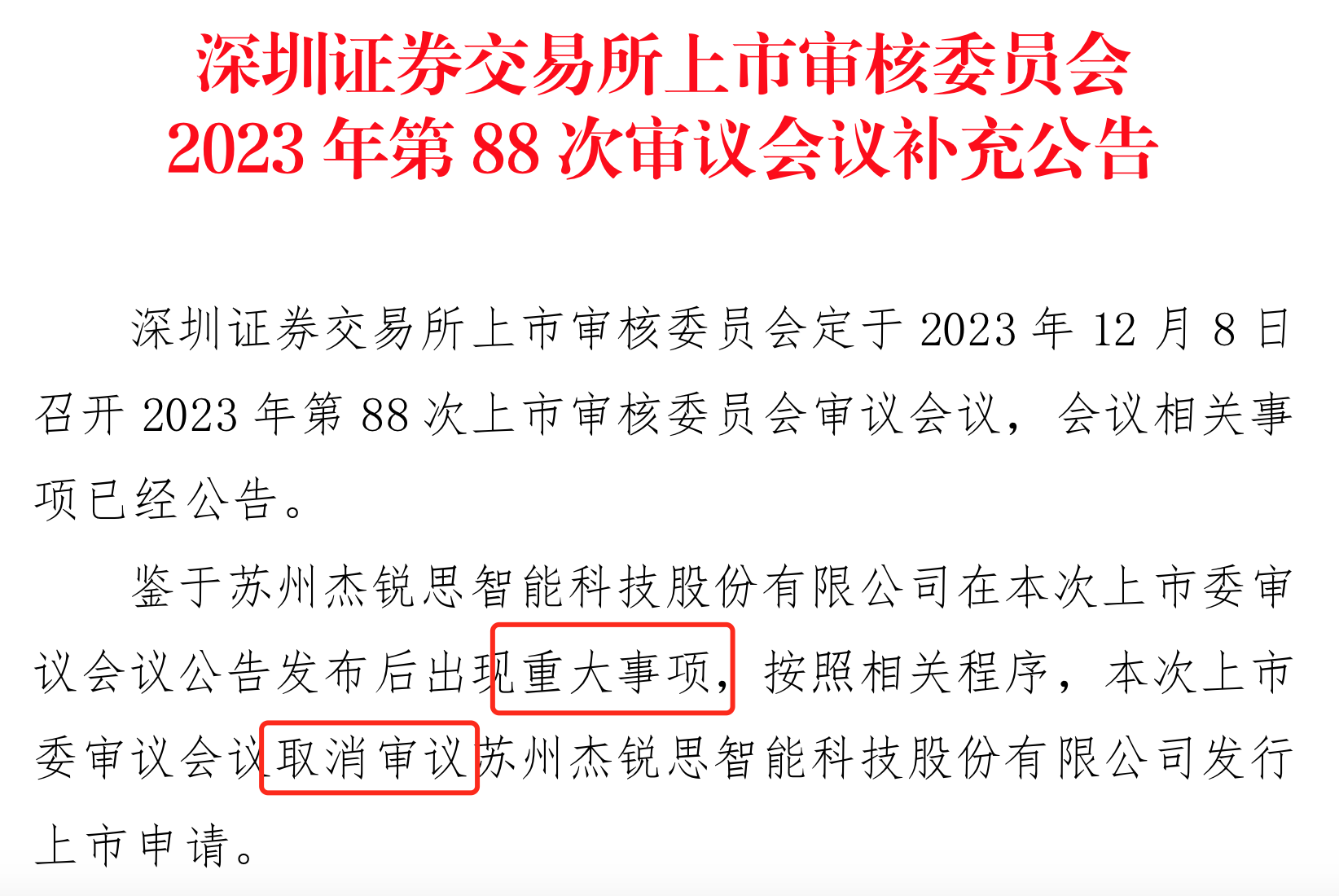 深交所方面,上周出现罕见状况。根据深交所上市委2023年第88次审议会议补充公告,鉴于杰锐思在上市委审议会议公告发布后出现重大事项,按照相关程序,上市委审议会议取消审议杰锐思发行上市申请。至于涉及到了何种重大事项,并未有细节。公开信息显示,杰锐思的目的地是创业板,保荐机构是东吴证券,预计融资额6.0364亿元。杰锐思是专业从事智能检测设备和智能生产组装设备(线)的研发、设计、生产及销售的科技型企业。