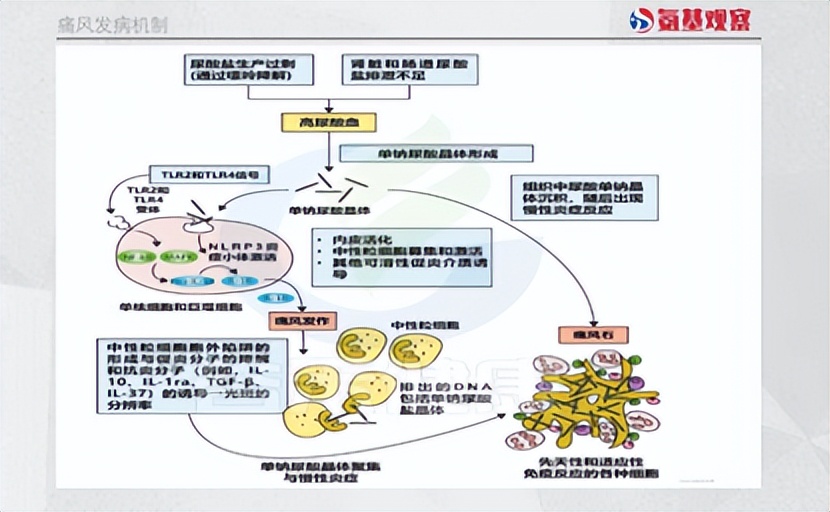 从发病机制来看,痛风的发生可分为四个阶段:高尿酸血症、尿酸单钠晶体沉积、急性炎症反应和晚期痛风。