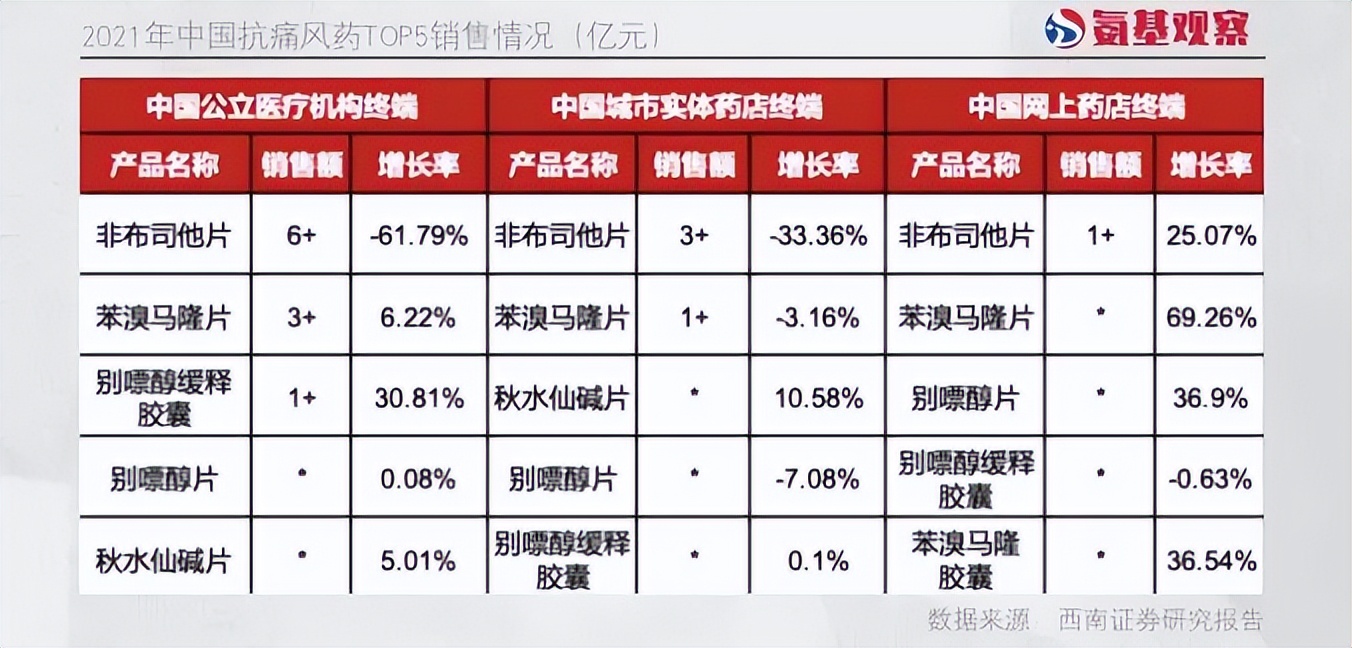 国内市场情况也基本如此。非布司他片和苯溴马隆片,是中国抗痛风药市场销售占比最高的两大品种。根据米内网数据,2021年这两大品种销售额占比超过70%。