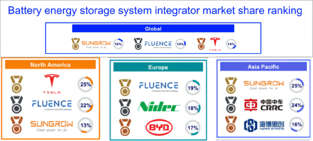 来自Wood Mackenzie的数据显示,2022年,阳光电源以16%的市场份额,将Fluence拉下马,登上全球第一的铁王座。Fluence、特斯拉、华为、比亚迪等位列其后,占比分别为14%、14%、9%、9%。