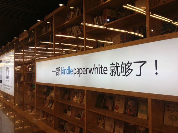 2014年11月,Kindle在上海静安寺地铁站设置了一个高2.8米、长25.6米的长廊书架。玻璃墙后面散落着2000本图书——2000本的数量,如果转化成标准大小电子书的话大约占用4GB内存,一台Kindle设备的容量。这个地铁营销事件当时在社交网络上也引来了极大的关注。
