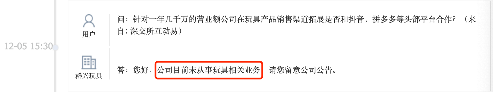 如此“引人误会”的案例在A股市场中还不少。作为“玩具第一股”的群兴玩具近日再在互动平台表示,其自身并无玩具业务。资料显示,群兴玩具主要从事酒类销售、自有物业租赁、物业管理服务等。