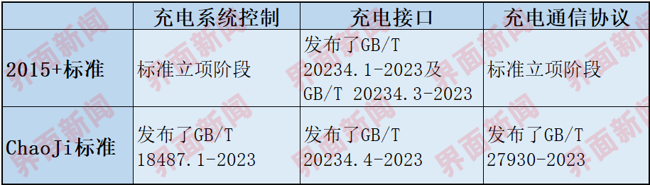 2023年9月,国家市场监督管理总局、国家标准化管理委员会公告,批准了五项与新能源汽车充电接口标准相关的推荐性国家标准。其中三项隶属于中电联主导的ChaoJi标准,另外两项则归口汽标委力推的2015+标准。