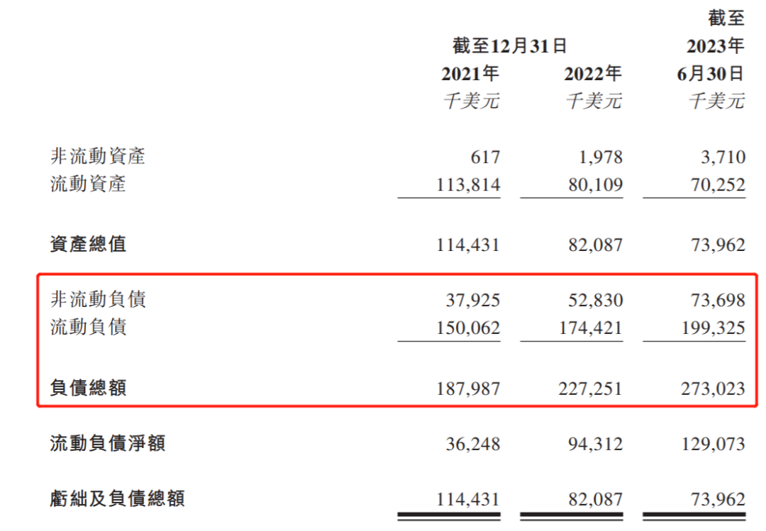 招股书披露,2021年、2022年及2023年上半年(以下简称“报告期”),拨康视云的负债总额分别为1.88亿美元、2.27亿美元和2.73亿美元,其中流动负债分别为1.5亿美元、1.74亿美元和1.99亿美元,非流动负债3792.5万美元、5283万美元和7369.8万美元。